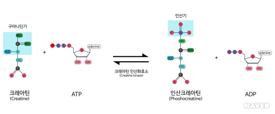 크레아틴은 신체 활동 시 사용되는 에너지 공급원인 ATP 생성에 사용되기 때문에 격렬한 고강도 운동 시 체내에 크레아틴이 충분해야 빠른 에너지 공급이 가능합니다.