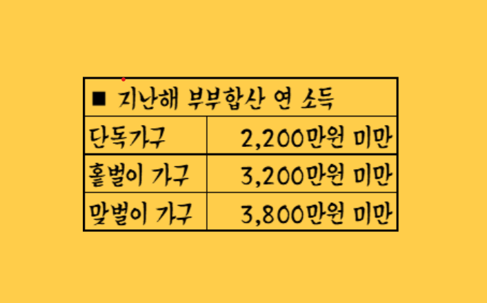 작년 부부 연 소득을 합산하여, 단독 가구는 2,200만 원, 홑벌이 가구는 3,200만 원, 맞벌이 가구는 3,800만 원 미만이어야 한다고 합니다.