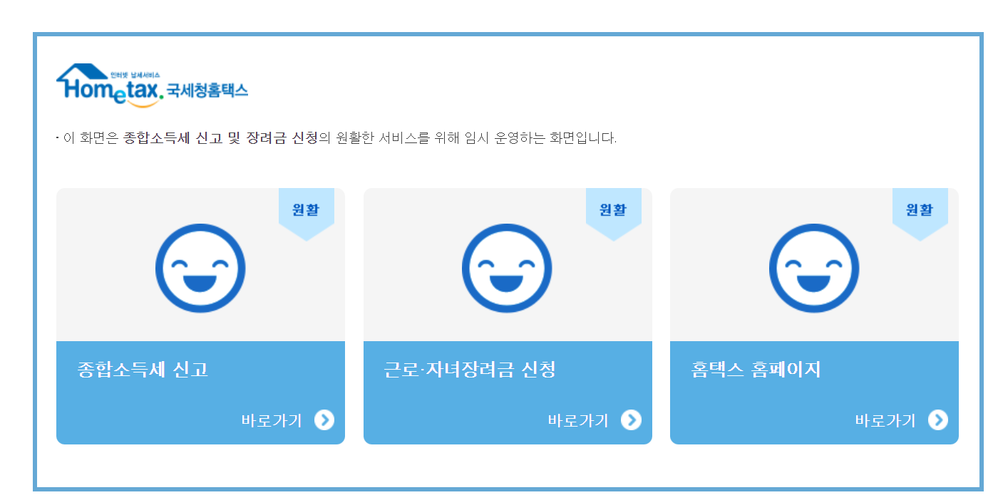 검색 엔진을 이용하여 '홈택스'를 검색하여 접속하시면 현재 위 화면이 먼저 노출되는데요.